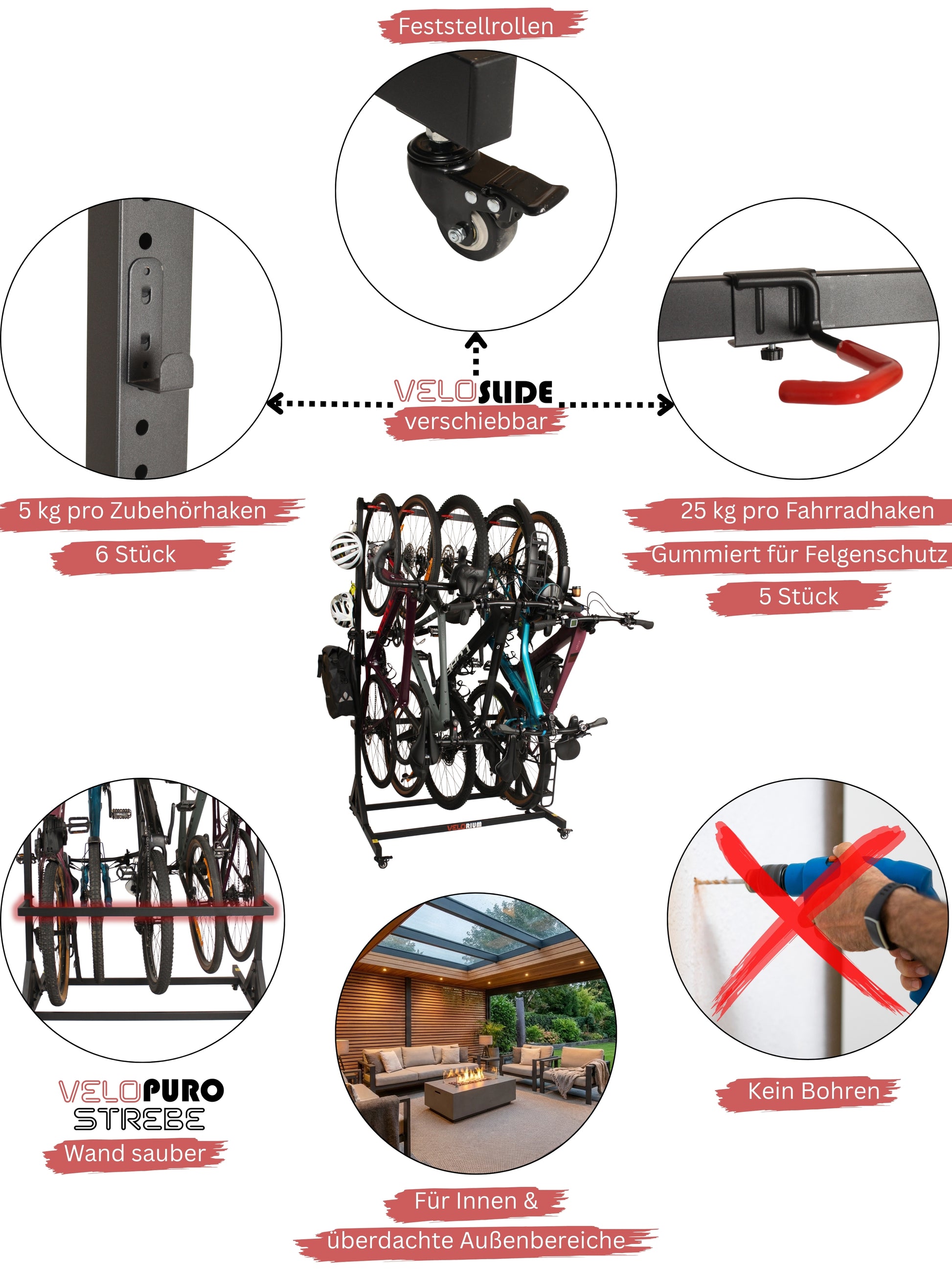 Platz für bis zu fünf Fahrräder sowie zusätzliche Haken für Helme, Taschen oder Schlösser.
